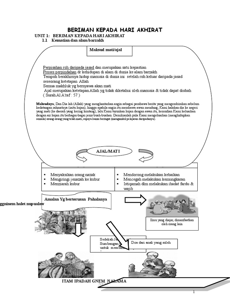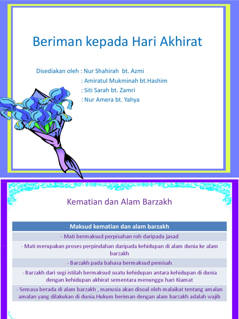 Seluruh alam semesta akan mengalami kehancuran dan manusia akan dibangkitkan di kuburnya untuk mempertanggungjawabkan setiap amalan selama hidup di dunia. Pengertian iman kepada hari akhir menurut bahasa (etimologi) adalah percaya akan datangnya hari akhir/kiamat. Beriman kepada hari akhir merupakan salah satu rukun iman. Setelah mati roh seseorang akan berada di alam barzah atau alam kubur yang merupakan alam antara dunia dan akhirat. Beriman kepada kitab allah pendidikan islam tahun 3.