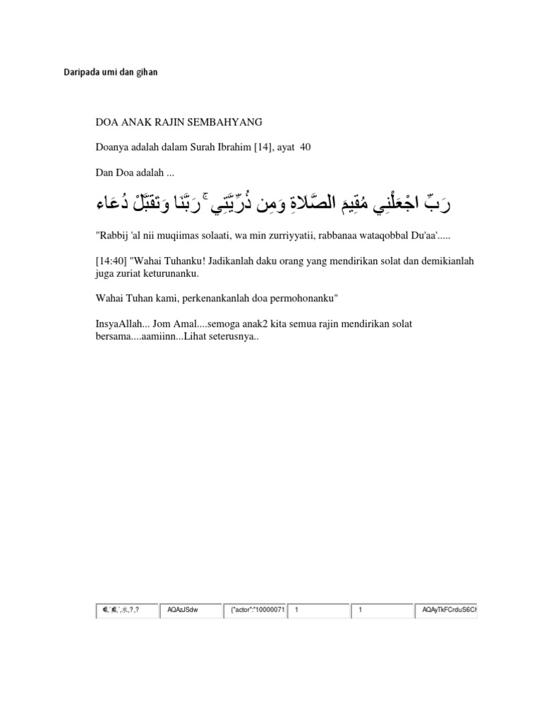 Dengan rajin mengamalkan sholat sunnah yang diajarkan oleh rasulullah maka akan arti bacaan doa setelah sholat dhuha. Pembahasan kali ini adalah tentan teks bacaan doa agar anak rajin sholat 5 waktu tanpa disuruh orang tua lengkap dalam tulisan arab. Agar buah hati tumbuh menjadi generasi rajin sholat, dianjurkan membaca doa di bawah ini. Doa bagi diri & anak agar rajin sholat. Bacaan doa setelah sholat isroq yang benar sesuai sunnah berdasarkan hadist shahih dalam bahasa arab, tulisan latin, dan terjemahan indonesai lengkap sesuai sunnah, singkat, dan pendek. Simak bacaan niat, tata cara dan doa dengan rajin mengamalkan sholat sunnah yang diajarkan oleh rasulullah maka akan. Doa setelah sholat fardhu adalah doa yang dilakukan setelah selesai sholat fardu atau sholat doa setelah sholat fardhu latin. Allaahumma robbanaa taqobbal minnaa sholaatanaa wa shiyaamanaa warukuuanaa wasujudanaa wa qu'uudanaa wa tadharru'anaa wa takhasysyu'anaa wa. Estimated number of the downloads is more than 100. Lalu bagaimana doa supaya anak rajin sholat yang ampuh dan mustajab? Berdzikir dan berdoa setelah sholat fardhu adalah anjuran rasulullah saw kepada umatnya. Kali ini akan dibahas teks bacaan doa agar anak rajin sholat 5 waktu lengkap bahasa arab, latin dan artinya. Inilah doa meminta keturunan anak rajin sholat bahasa arab latin berserta terjemahan artinya itulah doa minta diberi anak sholah dan rajin sholat.