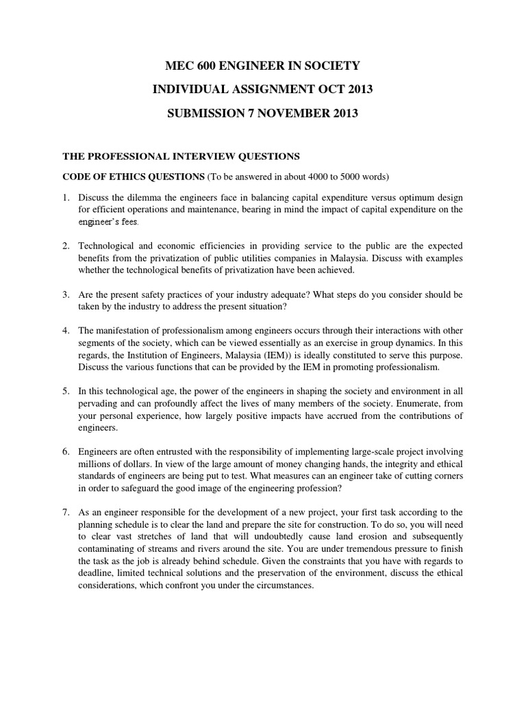 Questions to ask the interviewer. Job interview questions and answer examples for all industries and levels. Basically, all of these questions should be answered according to regulations of professional conduct. Explaining him the importance of ethic as recommended by institution of engineers (iem) and board of engineers (bem) (2014, 12). Nervous about an upcoming hr interview?