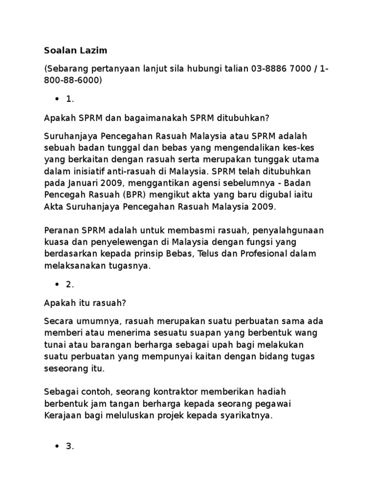 Penubuhan suruhanjaya pencegahan rasuah malaysia 5. Semua ketua setiausaha kementerian %mua ketua jabatan persekutoan. Sekiranya anda, seorang warganegara malaysia yang cukup syarat kelayakan dan berumur tidak kurang daripada 18 tahun. · suruhanjaya pencegahan rasuah malaysia (sprm) yang dahulunya dikenali sebagai badan pencegah rasuah, malaysia atau singkatannya bpr mula beroperasi pada 1 oktober 1967 sebagai sebuah jabatan penuh. Rasuah rasuah dalam konteks akta suruhanjaya pencegahan rasuah malaysia 2009 (akta 694) membawa maksud memberi atau menawarkan, menerima atau meminta atau setuju untuk menerima atau meminta suapan secara langsung atau tidak langsung sebagai dorongan atau upah untuk.