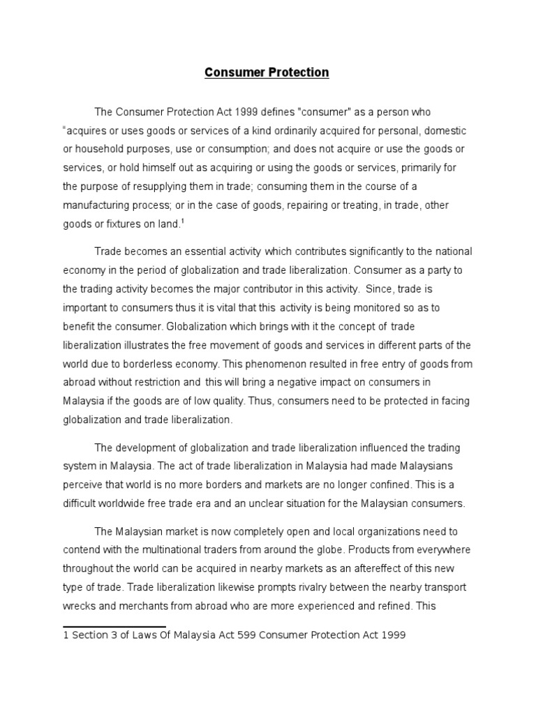 Consumer protection act 1999 to ensure and protect the rights of consumers and, in particular to review and keep under review business practices, to regulate product safety, to ensure the provision of adequate information to the consumer and to monitor the timeliness of repairs and other services; (b) 415/1999] be it enacted by the parliament of malaysia as follows: This act was enforced to protect consumers from unethical business transactions especially regarding buying and selling matters between dealers and consumers. Oct 26, 1999 · passed house & senate (president next) on oct 26, 1999 this bill was passed by congress on october 26, 1999 but was not enacted before the end of its congressional session. An act to provide for the protection of consumers, the establishment of the national consumer advisory council and the tribunal for consumer claims, and for matters connected therewith.